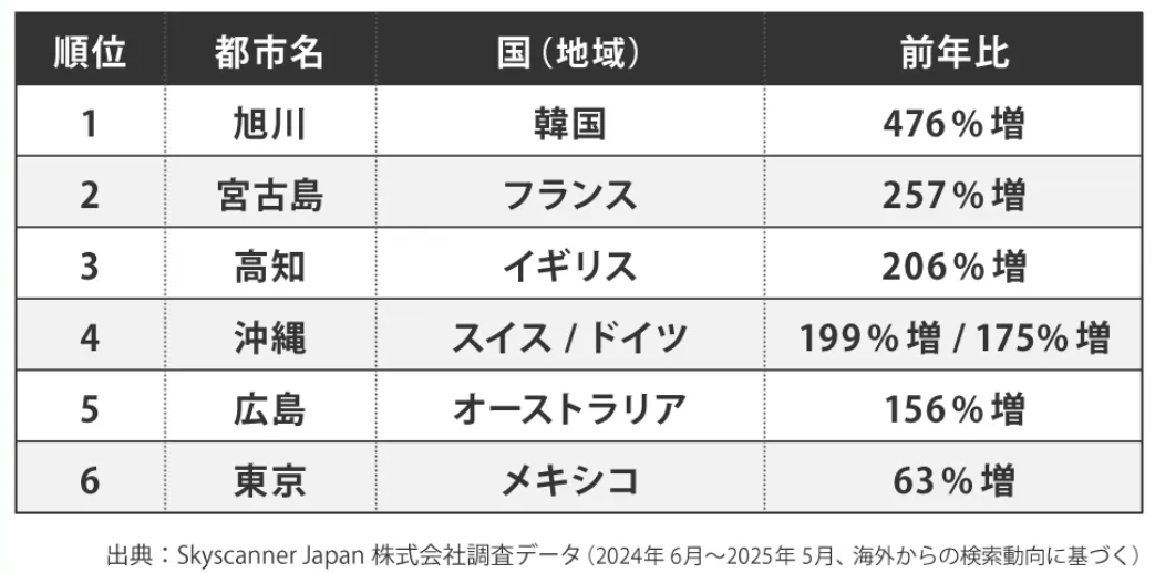 韓国からの検索では旭川市が前年比476%増、フランスからは宮古島市が257%増、イギリスからは高知市が206%増となり、自然や地域文化を体験できる都市への注目が顕著です。また、スイスやドイツからの沖縄県検索もそれぞれ199%増、175%増と伸長しています。