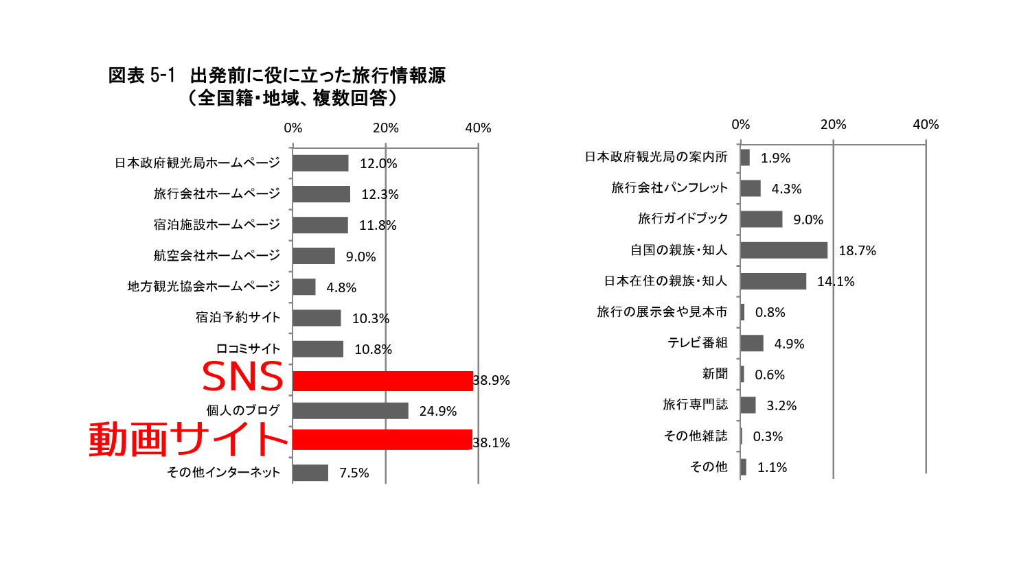 観光庁のアンケートによると、訪日外国人の出発前に役立った情報源として、SNS(38.9%)、動画サイト(38.1%)、個人のブログ(24.9%)という結果となっており、旅マエの情報収集においてSNSや動画コンテンツの影響力が特に高いことがうかがえます。訪日外国人の多くが、動画やSNSを参考にしながら旅のプランを立てていることが分かります。