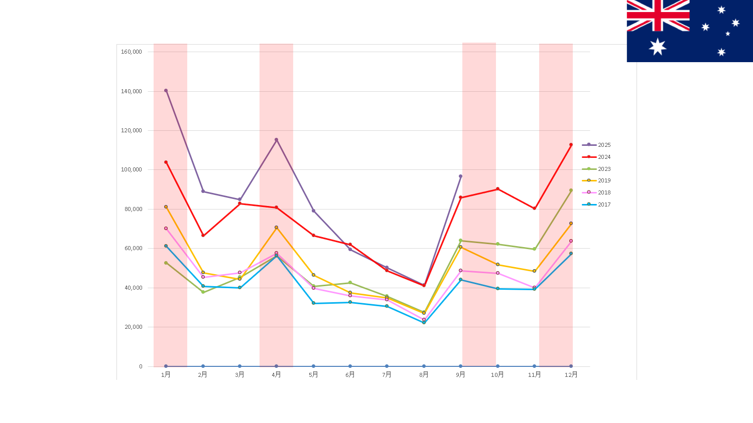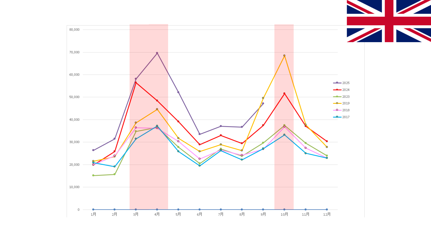 英国からの訪日観光客は、3月と10月に大きなピークが見られますが、それ以外の時期は比較的安定した人数の推移を示します。特に、4月には桜シーズンとイースター休暇の影響でピークが訪れ、10月には紅葉シーズンと学校の秋休みが重なるため、もう一つの大きなピークとなります。加えて、円安の影響で2025年の訪日客数(紫線)は大きく増加しています。7月の夏休み・バカンスシーズンも一応ピークとなりますが、カナダ同様、他のシーズンほどの盛り上がりには欠ける印象です。