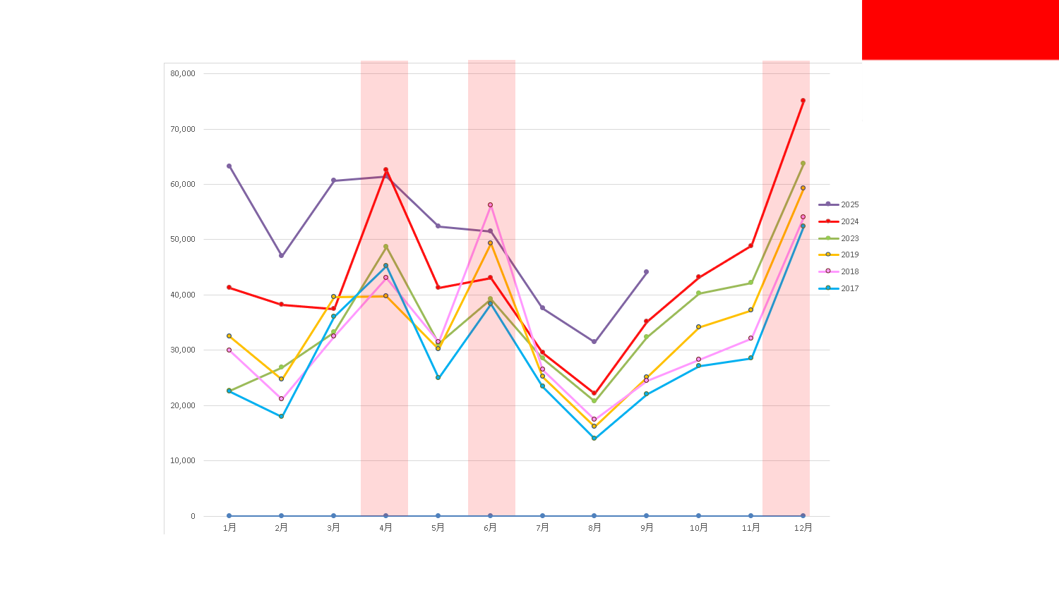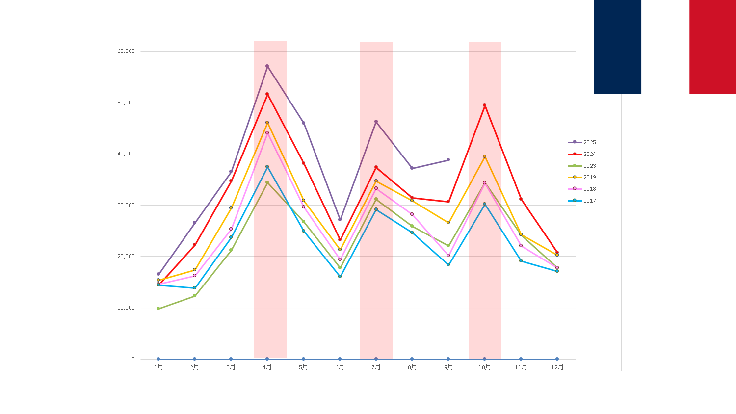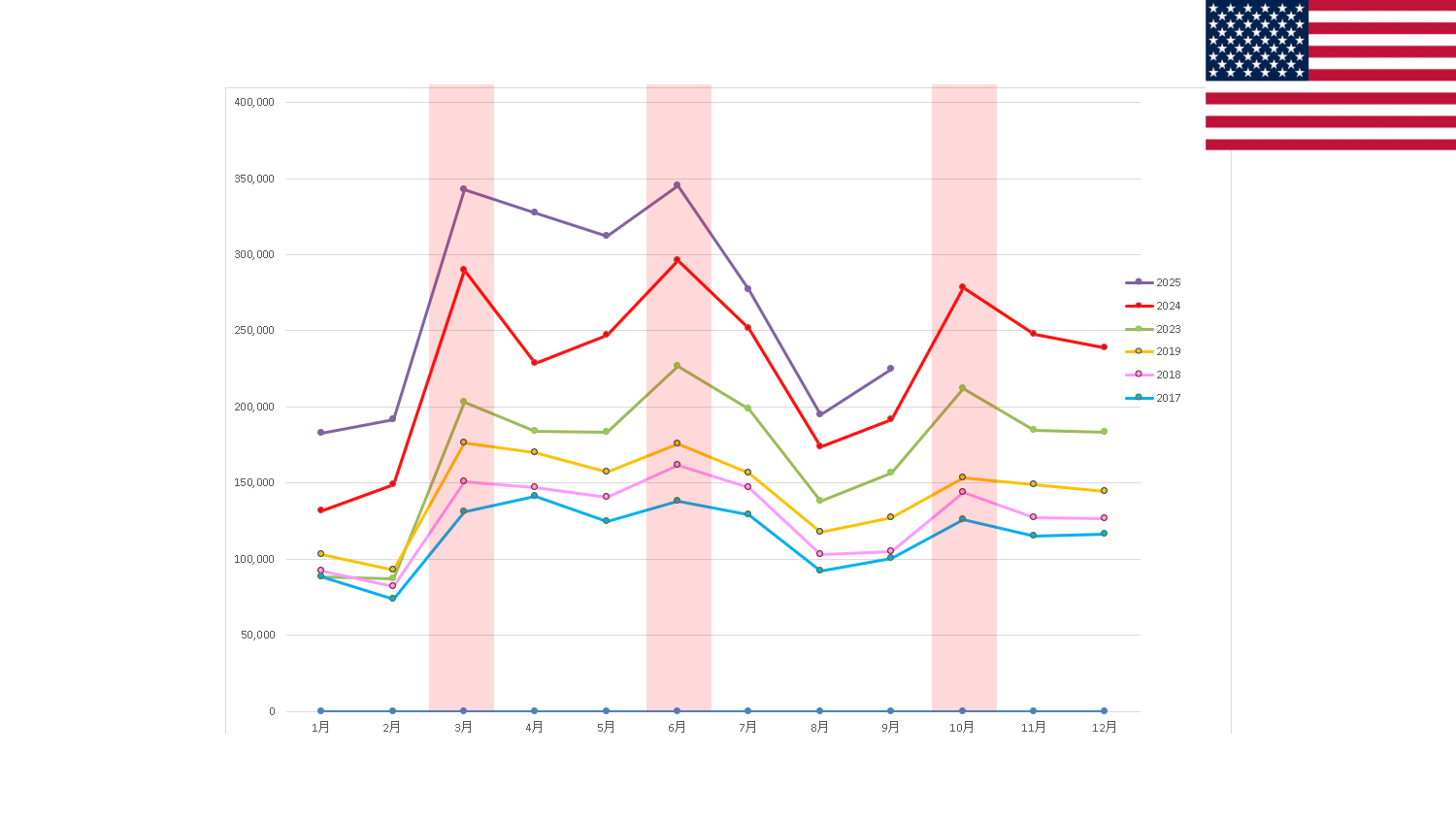 2017年以降、アメリカからの訪日観光客の来日タイミングには大きな変化がなく、安定した傾向が見られます。特に、3月から4月の桜シーズンにはイースター休暇の影響もあって訪日者数が増加し、夏休みシーズンの6月から7月にかけてピークを迎えます。また、10月には紅葉需要もあり、夏の観光シーズンから再び盛り上がりを見せる時期となっています。さらに、円安の影響により旅行コストが割安になったことで、2025年春にはアメリカからの訪日客が特に増加する傾向が見られました。