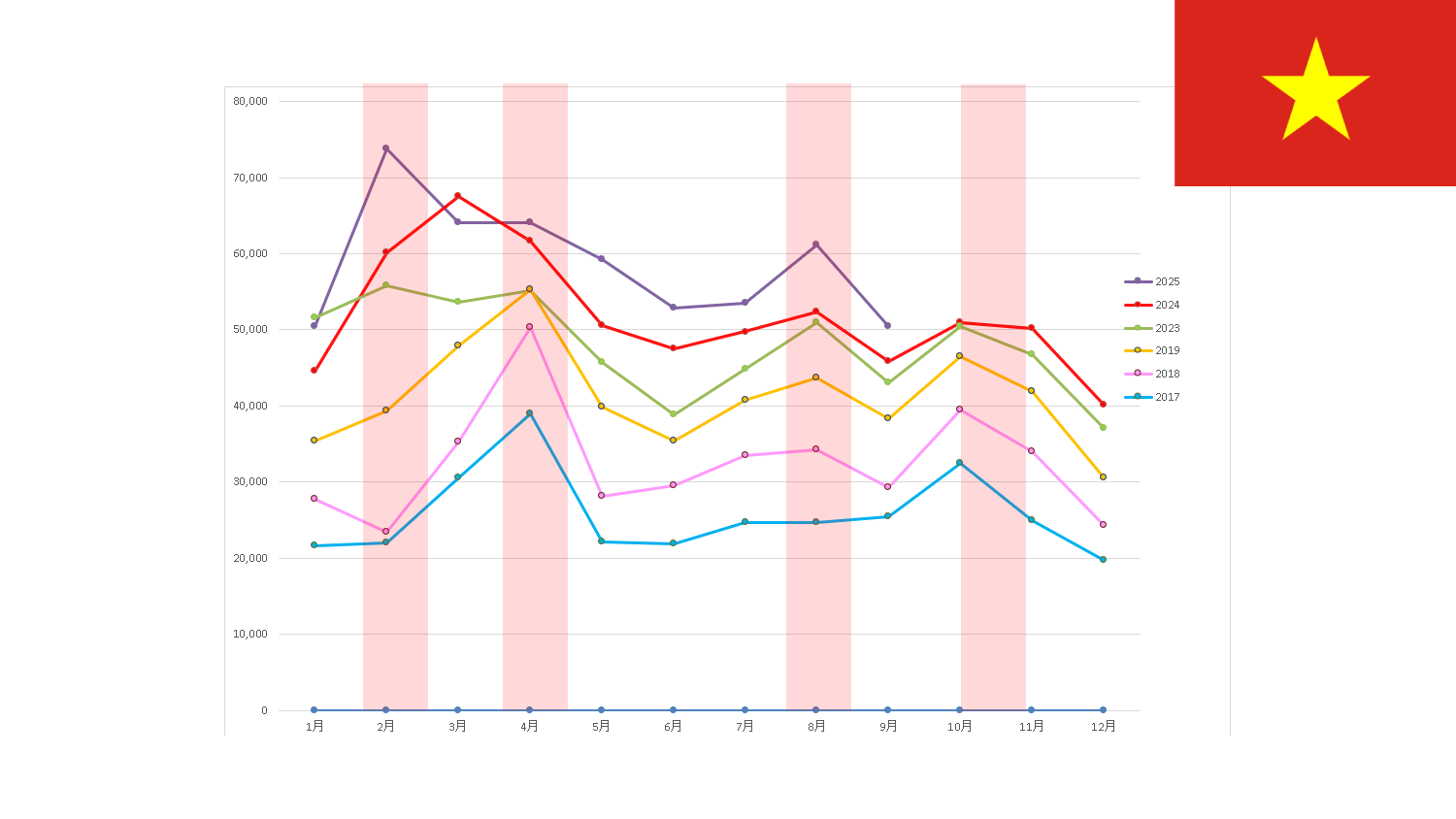 コロナ前の2019年までの傾向では、訪日ベトナム人は4月に最も多く訪れていましたが、2025年は桜シーズンを上回る2月に過去最大の訪日者数が記録されました。一般的に東南アジアからの訪日外国人は冬季が人気ですが、ベトナム人に関しては2月~4月のシーズンがピークでした。また、夏季にも大きな減少は見られず、年間を通して安定した需要があるのが特徴です。年間を通して訪日数は安定しており、春季に加えて8月と10月の人気も高まっていることが伺えます。