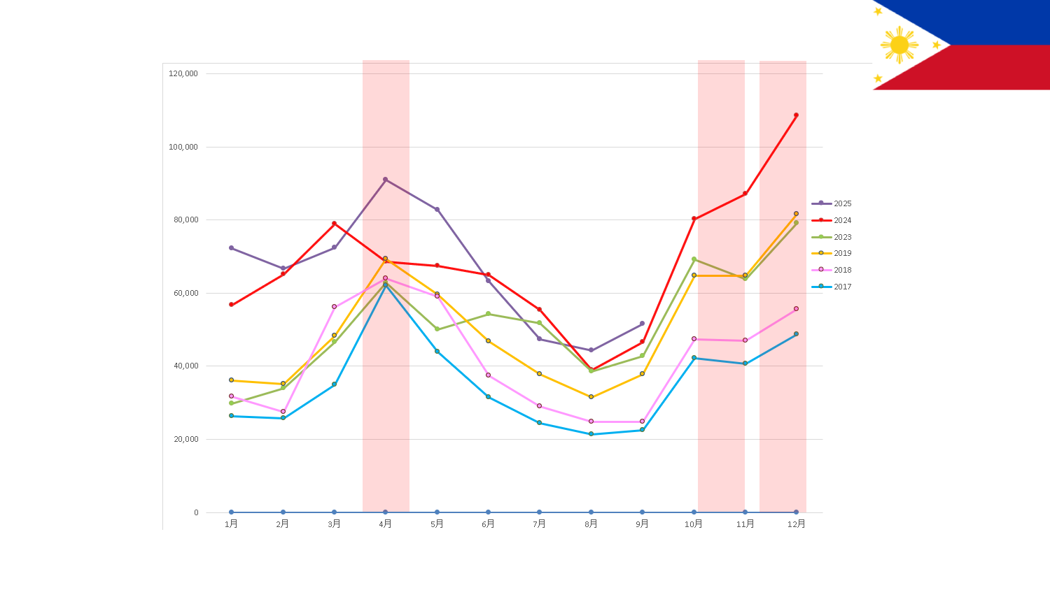 フィリピンからの訪日観光客は、桜の季節と秋のシーズンが最も人気のある時期となっています。コロナ後は訪日者数が約2倍に増加しました。2024年には、最も多かったのは12月で、次いで3月でした。また、10月から11月にかけても人気がありました。一方、夏季、特に8月は訪日客数が減少傾向にあり、2025年4月には過去最大の訪日者数が記録されました。