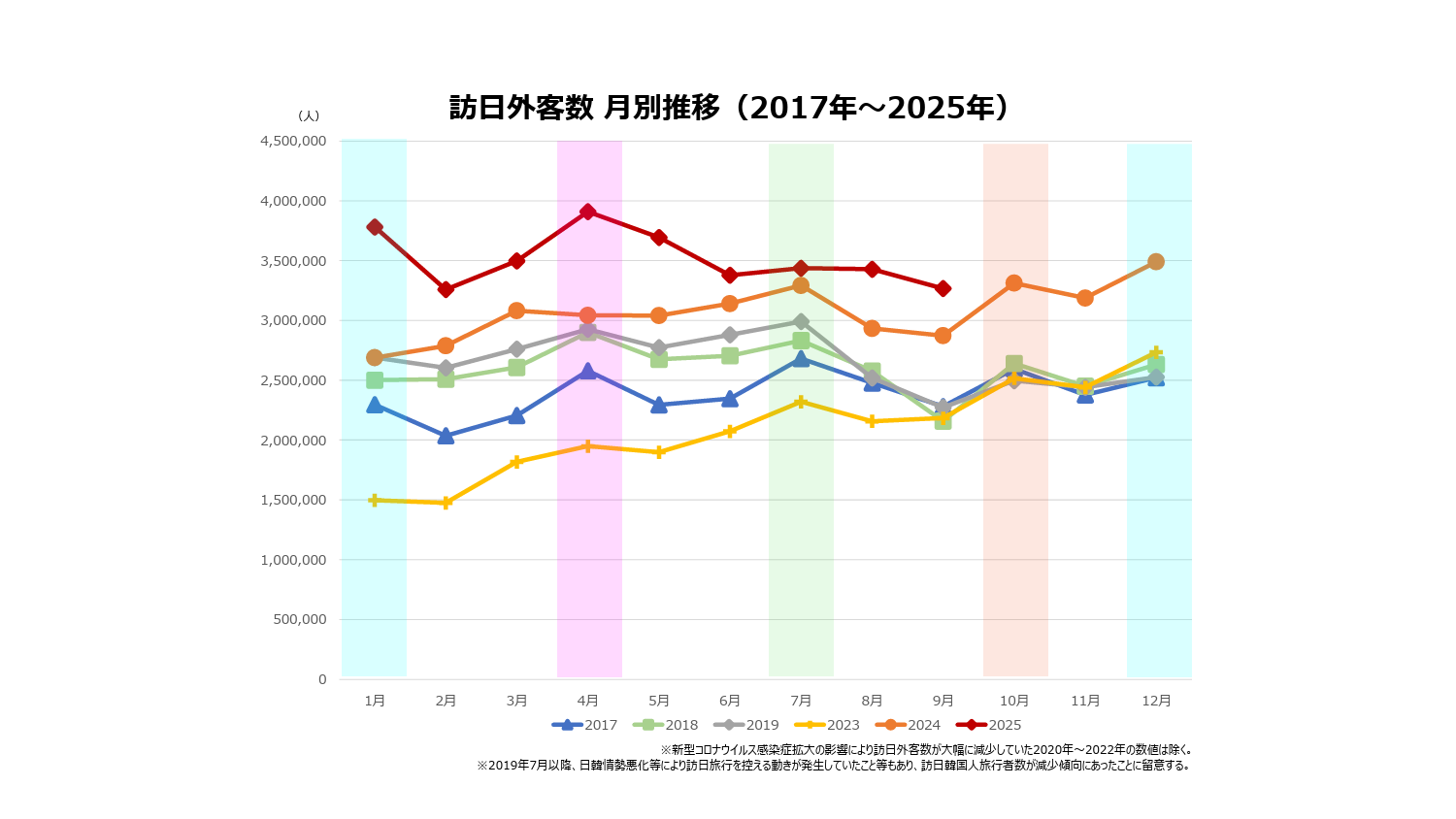 2025年の桜シーズン(4月)には、2024年の水準を大幅に超え、過去最大の訪日者数を記録しました。また、12月から1月にかけての期間には、アジアやオーストラリアからの観光客が多く日本を訪れています。