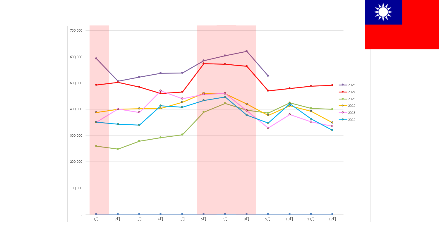 台湾からの訪日観光客は、年間を通じて安定した来日傾向を示しており、日本に近いという地理的要因もあり、特定のシーズンに限らずさまざまな季節を楽しむために訪日するケースが多いようです。特にリピーターが多く、「長期休暇だから日本へ」というよりも、季節ごとの魅力を求めて訪れる傾向があります。
