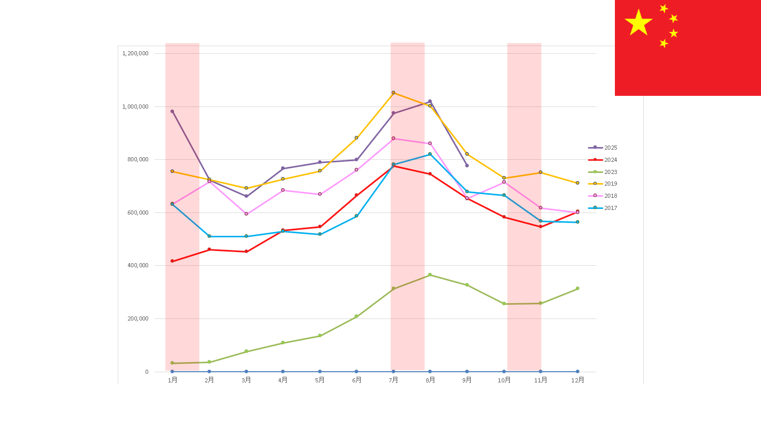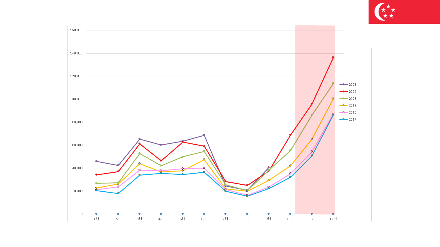 コロナ前の2019年までの傾向でも、訪日シンガポール人が最も増加するのは12月でした。一方で、8月に訪日客が減少する点で、元々暑い場所から他の暑い場所に旅行するのを好まないです。2023年には、コロナ前を上回る訪日者数を記録し、過去最高を更新しました。2025年の来日パターンが変わっていないですが、少しずつ人数が増えていることが明らかです。