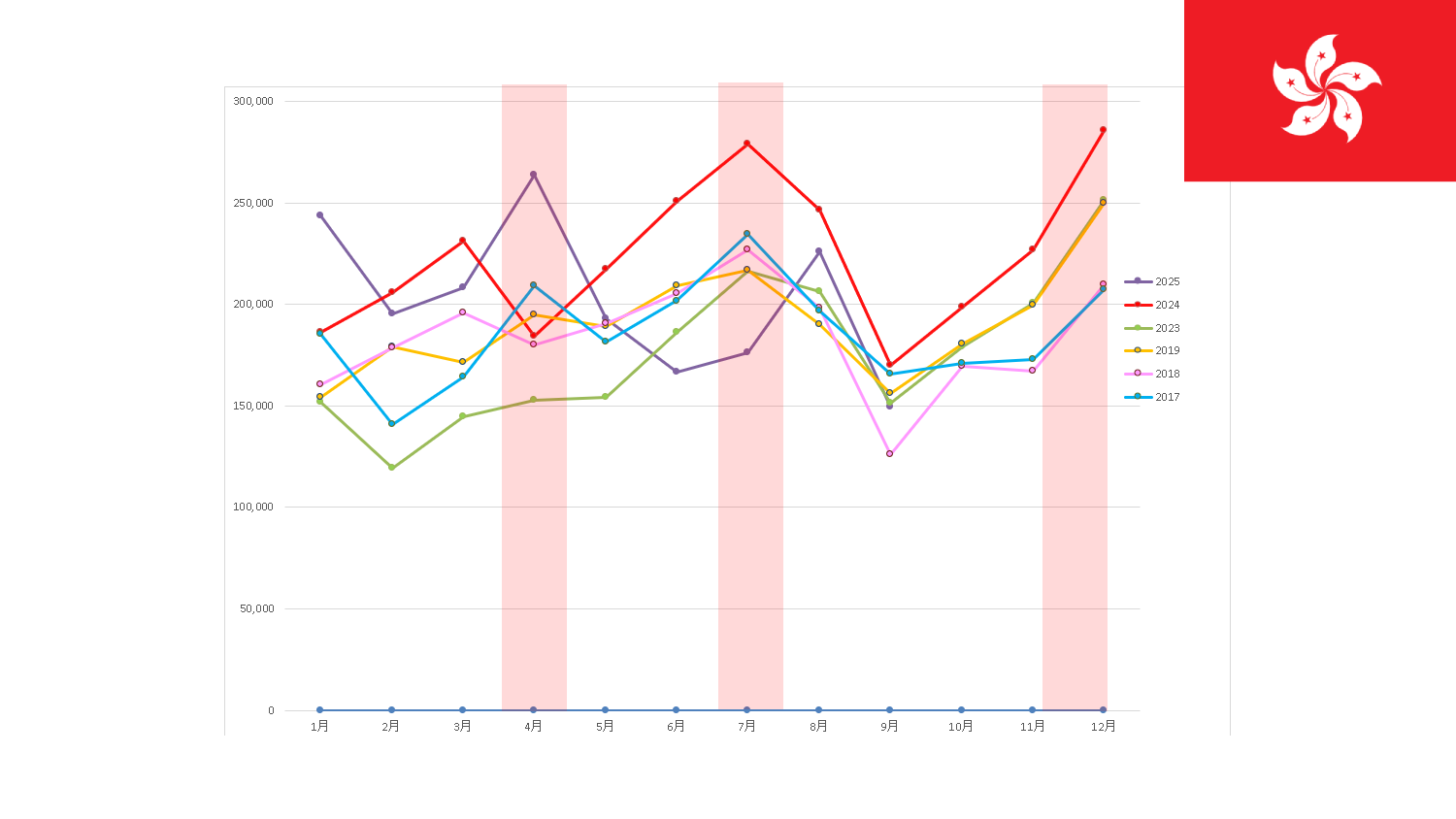 香港からの訪日観光客は、比較的9月の需要が少なく、7月と8月の夏休み・バカンスシーズン、そして12月のクリスマス休暇シーズンにピークを迎えます。次に、旧正月やイースターが続く4月にも訪日客が増える傾向があります。