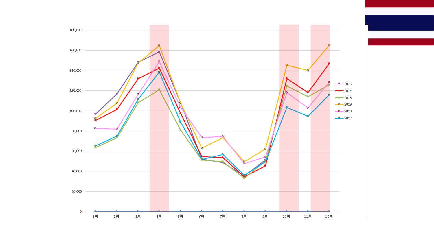 タイからの訪日傾向は2017年以降大きな変化はなく、コロナ後は訪日者数の伸びが緩やかになっていますが、依然として人気のシーズンに集中しています。しかし2025年は去年より多少少ない数値となっています。訪日タイ人観光客は、桜や紅葉のシーズンを好み、タイ正月(ソンクラーン)のある3月〜4月、また雨季と乾季の境目である10月にピークを迎えます。さらに、12月には日本の雪景色を見たいという需要が高まり、訪日客数が増加する傾向が見られます。