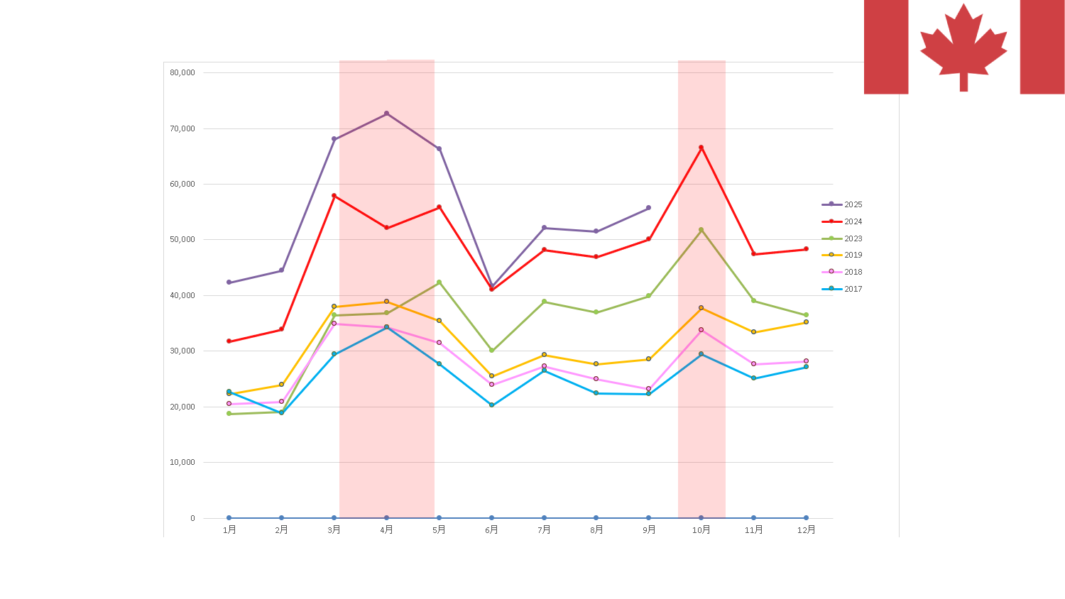 カナダからの訪日観光客はフライト時間が長いため、年間を通じて大きな変動は少ないものの、特に3月の春シーズンにピークが見られます。コロナ後、米ドルだけでなくカナダドルに対しても円安が進行し、それによりインバウンド消費額が増加、2025年の訪日カナダ人客数(紫線)が大きく伸びています。人気の秋シーズンが今年最大人数になると予測誰されています。