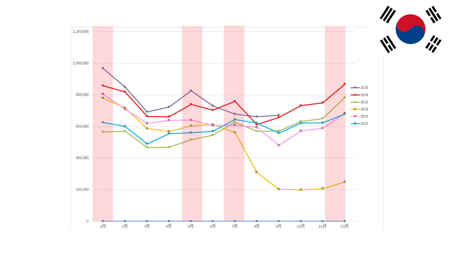 2番目の大きなピークは、5月と7月の夏休みシーズンに見られます。これは、日本人が週末を利用して韓国に旅行するように、韓国からの観光客もまた、日本を国内旅行の延長線上として気軽に訪れる旅行先と認識しているためです。